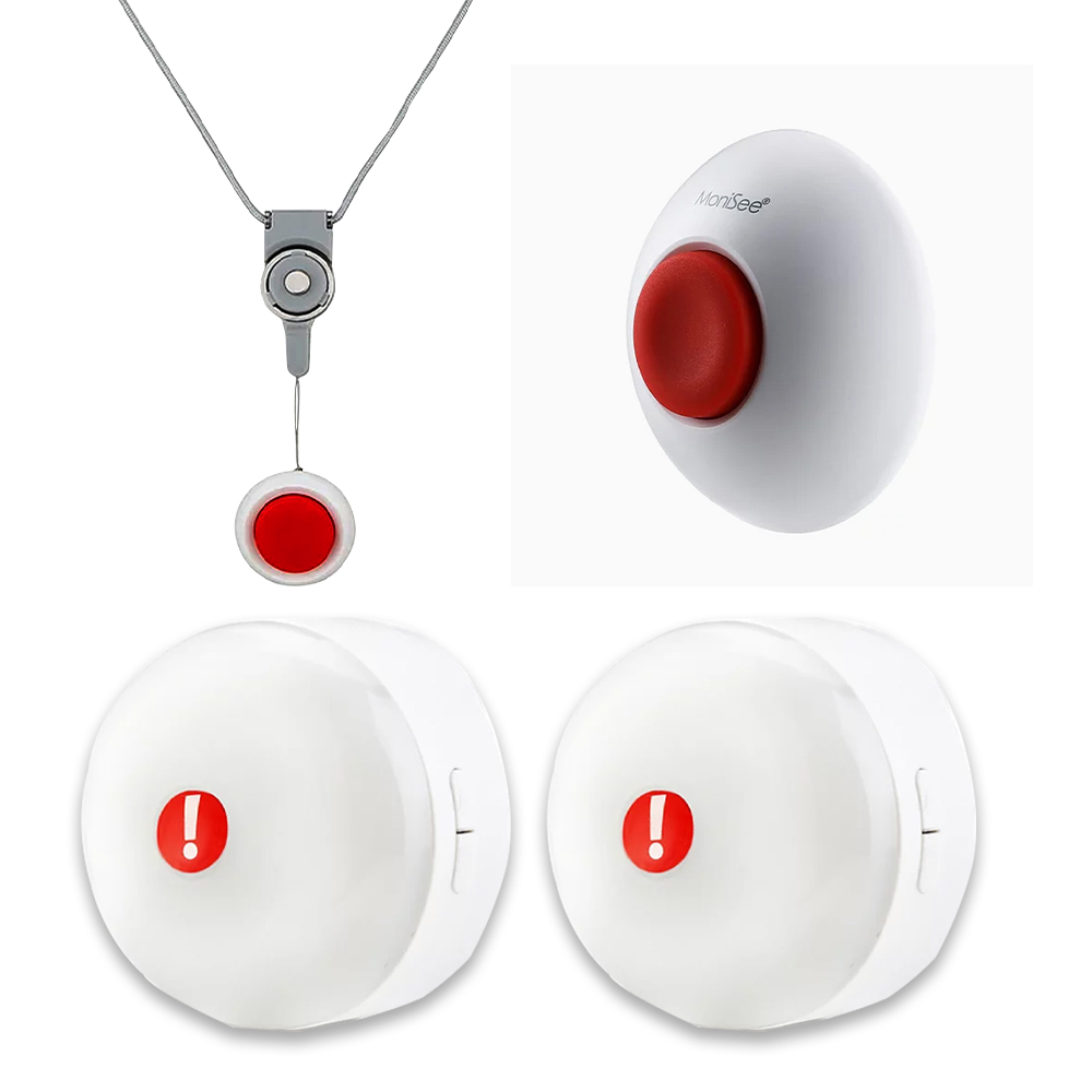 【 莫尼希MoniSee無線緊急求救看護呼叫器 】 不只是呼叫器 !接收器 可分別放在多個照顧者(家人丶保姆丶看護)身邊,緊急呼叫器交給老人丶病人丶或行動不便的人,也可同時放置在多個定點(房間丶浴室丶樓梯間),讓關愛無處不在。