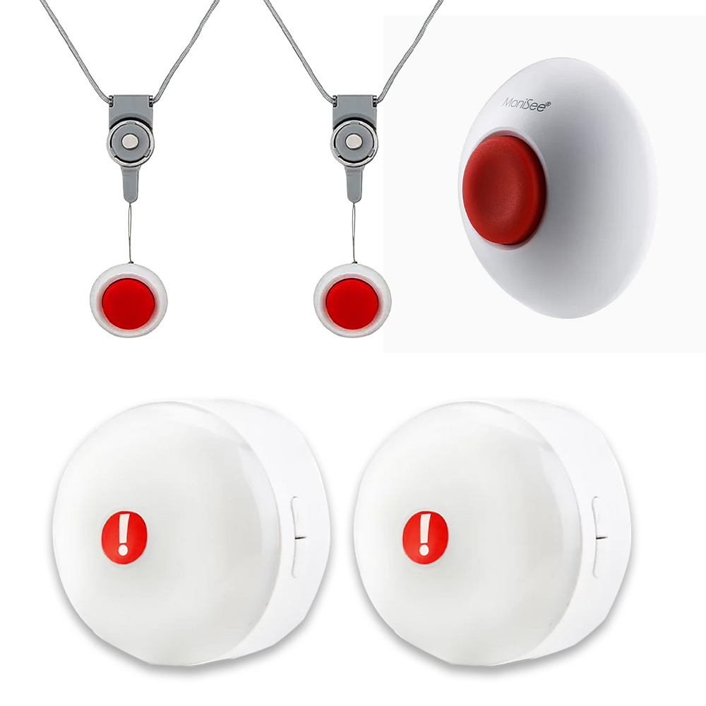 【 莫尼希MoniSee無線緊急求救看護呼叫器 】 不只是呼叫器 !接收器 可分別放在多個照顧者(家人丶保姆丶看護)身邊,緊急呼叫器交給老人丶病人丶或行動不便的人,也可同時放置在多個定點(房間丶浴室丶樓梯間),讓關愛無處不在。